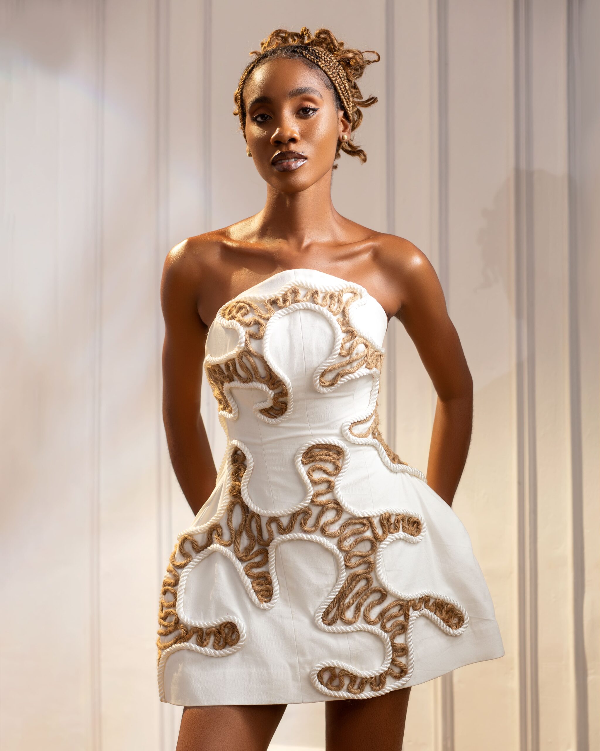 This strapless silhouette is defined by its meticulously woven appliqué, artfully layered to create depth, movement, and visual poetry. The bodice contours the form with architectural elegance, while the sculpted skirt unfolds with a soft yet commanding presence. Every curve, every detail, is intentional — a balance of structure and fluidity rendered in exquisite harmony.